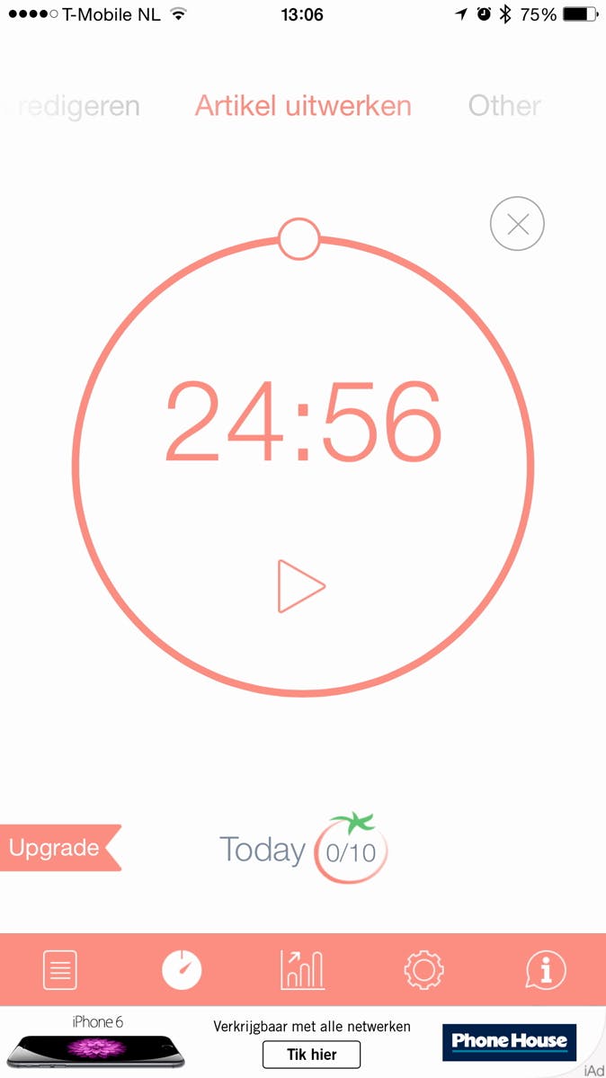 De app Pomodoro Time heeft naast een timer ook een ingebouwde takenlijst. Er is zelfs een Apple Watch-app die je een signaal geeft als er een periode van 25 minuten op zit. De gratis versie heeft wat reclamebanners, en het is niet mogelijk om lijsten tussen meerdere apparaten te synchroniseren. Daarvoor heb je de betaalde versie van twee euro nodig.