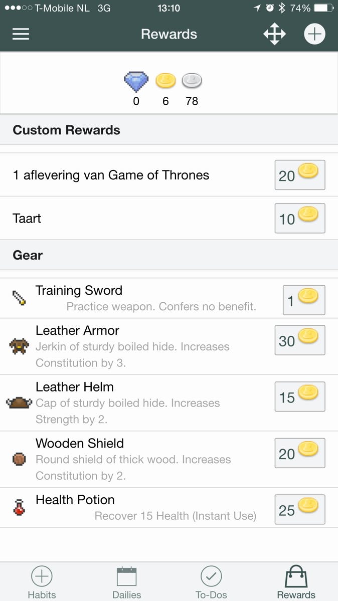 De interface van Habitica is lekker simpel, maar het invoeren van veel taken is via de app wat omslachtig. Gelukkig is er een website waar je veel makkelijker al je gewoontes en taken in kan voeren, die automatisch synchroniseren met je iPhone. Daarop kun je vervolgens de score bijhouden en zo je klusjes een beetje leuker maken.