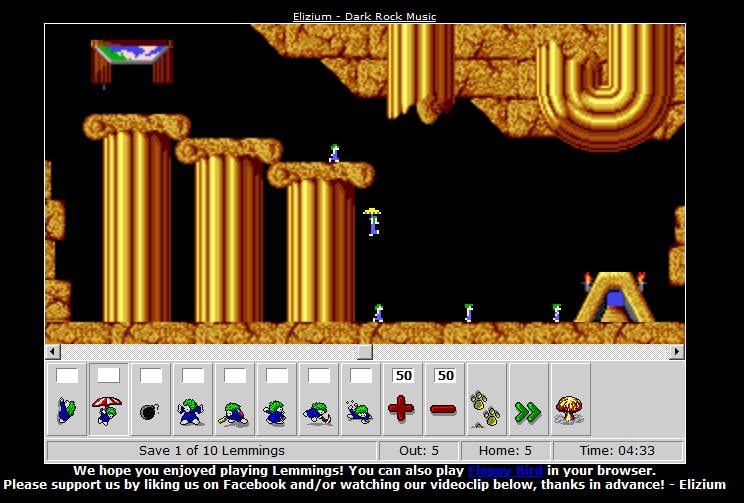 In 1991 verscheen er een game voor de toenmalige grafische wondercomputer Amiga met een uniek concept; de speler kon de spelfiguurtjes een taak toewijzen en moest zo zorgen dat een bepaald percentage heelhuids het doel bereikte. Het spel werd meteen immens populair en in verschillende varianten zijn er meer dan 20 miljoen exemplaren van verkocht. De naam van dat moois? Lemmings, een verwijzing naar de woelmuizen die soms massaal aan een trektocht beginnen. De online-versie DHTML Lemmings bevat 10 exacte replica’s van levels uit het origineel en combineert zo amusement met computerhistorie.