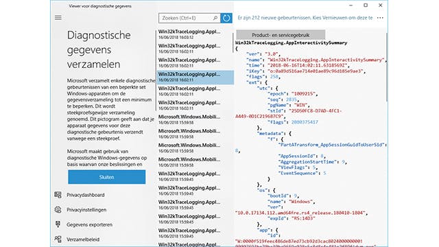Ook is er nog de Viewer voor diagnostische gegevens. Als je deze functie Aan zet, kun je die via de gelijknamige knop downloaden vanuit de Microsoft Store. Na de installatie kun je de tool via deze knop ook opstarten: je krijgt nu in xml-formaat te zien welke gegevens er precies richting Microsoft worden gestuurd.