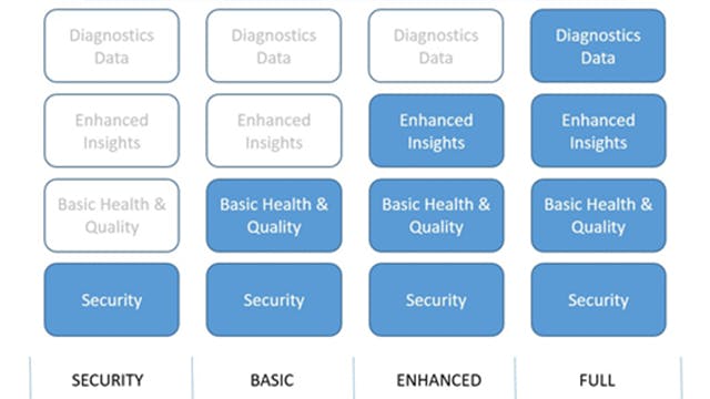 Het lijkt er dus op dat er twee modi beschikbaar zijn voor de telemetrische functies. Dat mag dan wel zo zijn op het niveau van de app Instellingen, onderliggend werkt Windows met vier modi (in ‘stijgende’ lijn): Beveiliging, Basis, Uitgebreid en Volledig. Die zijn echter alleen beschikbaar op Windows 10 Enterprise en Education, via de Editor voor lokaal groepsbeleid.