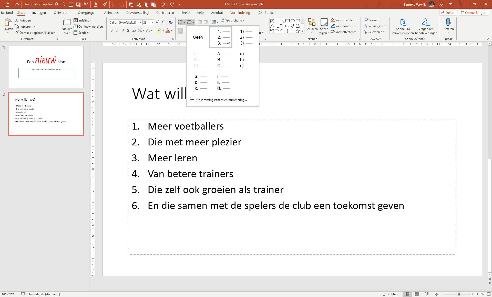 Een opsomming is een veelgebruikte manier om informatie op een dia te ordenen. Deze manier wordt zelfs zoveel gebruikt dat de tekst in het tekstvak van de indeling ‘Tekst en object’ standaard al de opmaak van een opsomming krijgt. Een opsomming kan zowel op de hele tekst in een tekstvak worden toegepast, als op een deel van de tekst in een tekstvak. Voorwaarde is wel dat de tekst uit meerdere alinea’s bestaat, dus dat er meerdere keren in de tekst op een nieuwe regel een nieuw tekstdeel is geschreven. Selecteer dan een deel van de totale tekst, de hele tekst of het hele tekstvak, kies voor Start / Alinea en selecteer bij Opsommingstekens de gewenste manier van opsommen. Behalve een opsomming waarbij voor aan iedere regel een punt of een ander teken staat, is het ook mogelijk de onderdelen te nummeren. Dat kan via de knop Nummering.