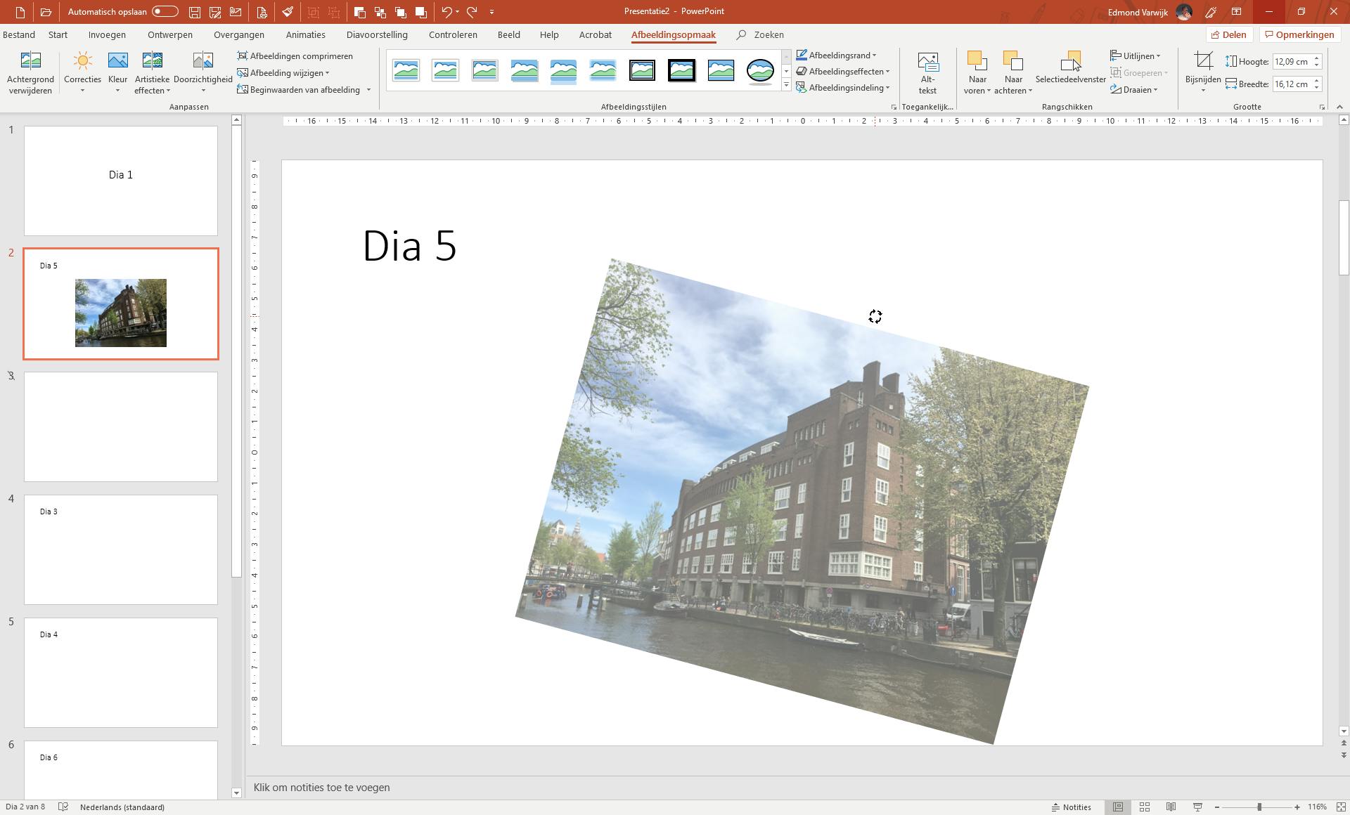 Elke afbeeldingsstijl is een combinatie van een aantal functies die ook gewoon los in PowerPoint zitten. Het betreft altijd een rand, een effect en een indeling. Deze opties vind je ook los naast de afbeeldingsstijlen en kun je dus ook los van elkaar toepassen. En je kunt er de standaard afbeeldingsstijlen mee aanpassen. Vind je bijvoorbeeld de dikke rand van de afbeeldingsstijl ‘Wit gedraaid’ niet mooi, maar de rest van de stijl wel? Voeg dan eerst de stijl toe, klik vervolgens op Afbeeldingsrand en maak via Dikte de rand minder dik. Zo kun je eindeloos stijlen combineren en aanpassen tot de afbeelding precies zo op de dia staat als jij wilt.