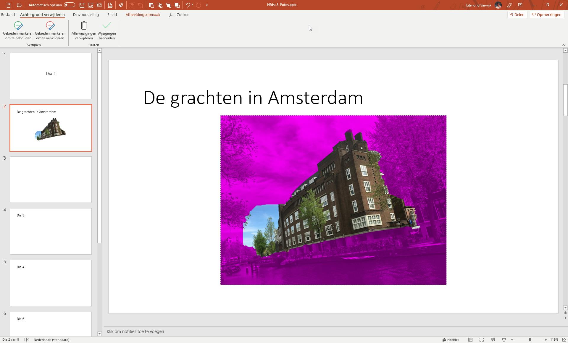 Wil je juist een deel verwijderen dat volgens PowerPoint behouden moet worden, klik dan op Gebieden markeren om te verwijderen en selecteer die delen. Ga door tot het precies naar wens is en klik dan op Wijzigingen behouden. Lukt het niet, klik dan op Alle wijzigingen verwijderen en begin rustig opnieuw. Terug in je presentatie zie je dat de foto nu is aangepast. De geselecteerde delen zijn uit de foto gesneden en doorzichtig geworden. Je kunt er tekst of een andere foto achter zetten en deze blijft dan gewoon zichtbaar.