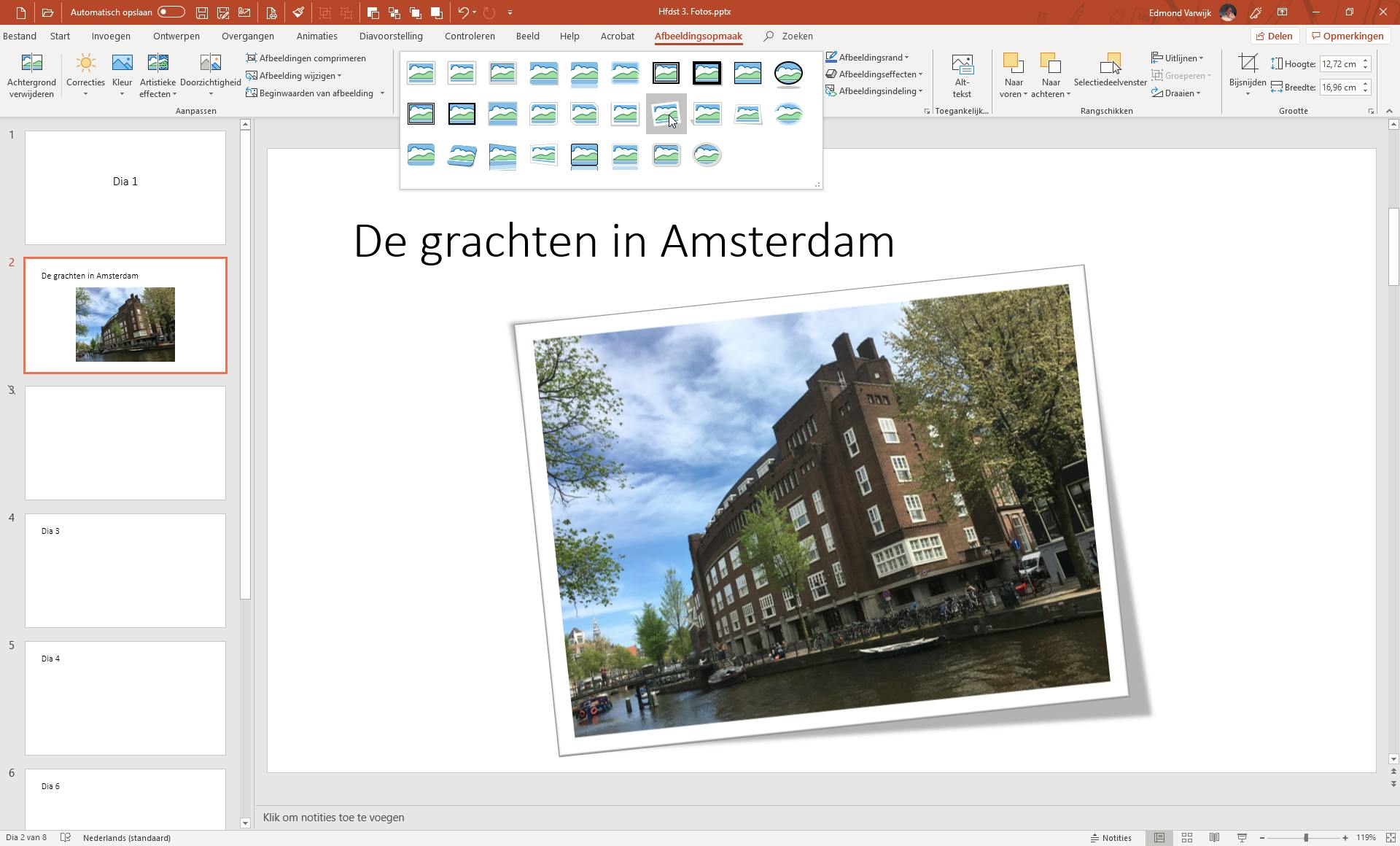 Wil je de foto niet zozeer aanpassen, maar wel heel mooi in de dia presenteren, dan kan dat met een van de kant-en-klare afbeeldingsstijlen. Hiermee plaats je de afbeeldingen in een frame of zet je ze op een mooie manier op de dia. Selecteer de foto en kies op de werkbalk Afbeeldingsopmaak bij Afbeeldingsstijlen voor een van de opties. Naast de stijlen die je direct al ziet, zijn er nog meer. Klik rechts van de stijlen op het pijltje omlaag om de andere stijlen zichtbaar te maken.