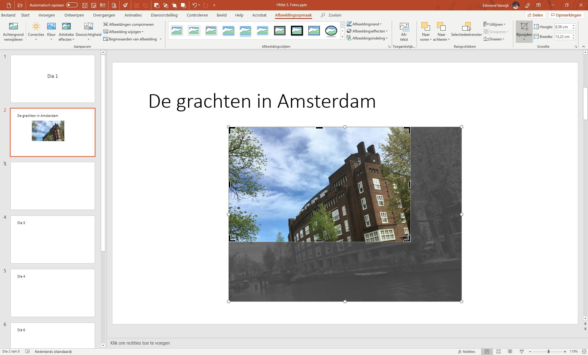 Wil je niet de hele foto gebruiken, maar een deel ervan, dan kun je de foto bijsnijden. Selecteer de foto en kies voor Bijsnijden. Op de rand van de foto verschijnen nu dikke zwarte grepen, op de hoeken en midden op elke zijde. Deze kun je met de muis verslepen om de foto bij te snijden. Vaak zul je vooral vanuit een hoek werken, maar dat hoeft niet. Ook een zijkant kun je snel digitaal afknippen. Het deel dat zal wegvallen, wordt eerst donkergrijs gemaakt. Pas wanneer je buiten de foto klikt, wordt deze ook echt bijgesneden.