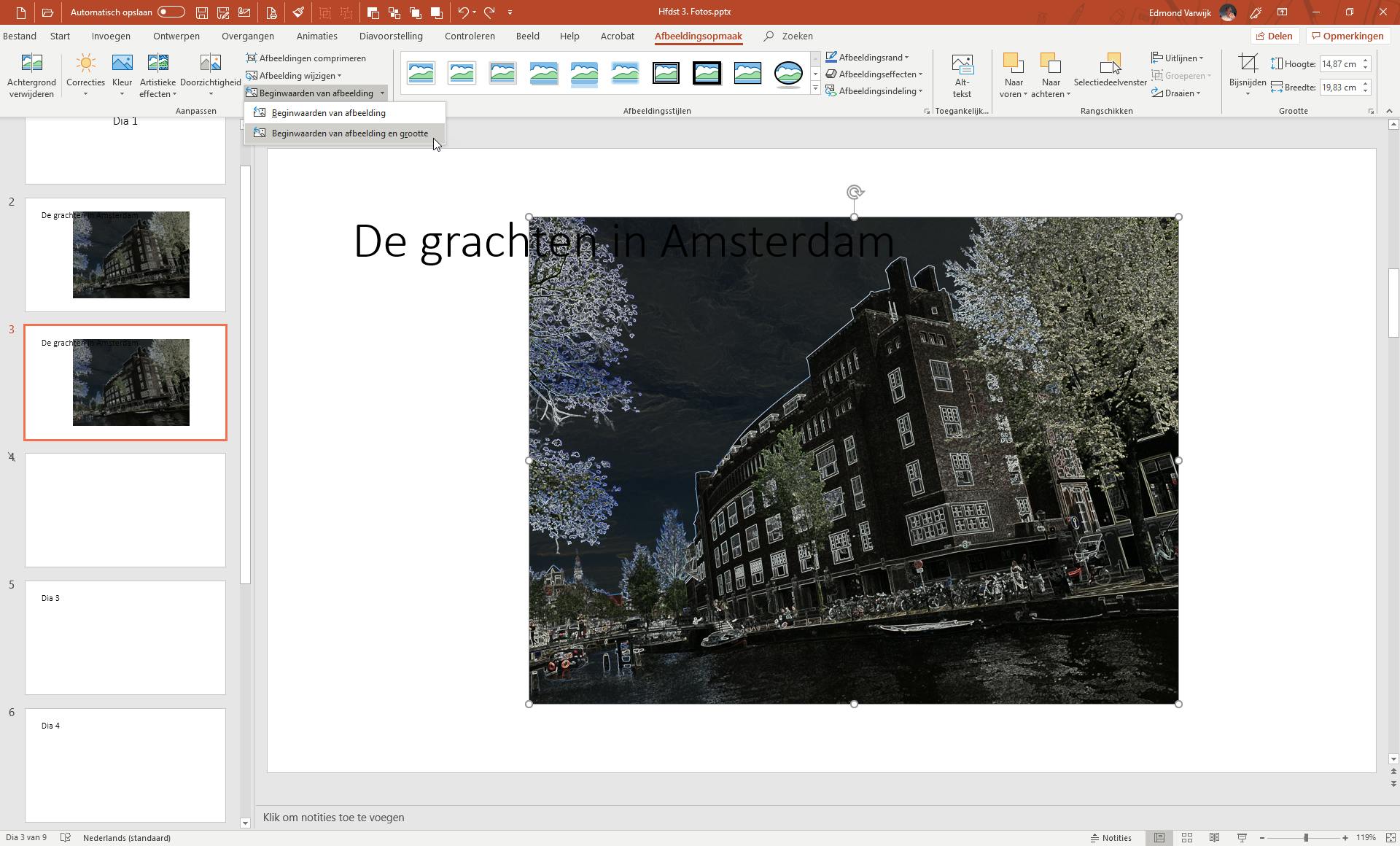 Heb je zo veel met de foto zitten knutselen dat je niet meer tevreden bent en het ook niet meer goed krijgt, dan kun je altijd terug naar af. Daarvoor is het gelukkig niet noodzakelijk om de hele presentatie weg te gooien. Selecteer de afbeelding of foto waar je niet meer tevreden over bent en kies dan op de werkbalk voor Afbeeldingsopmaak, Aanpassen en Beginwaarden van afbeelding. De afbeelding blijft nu op dezelfde plek en grootte staan, maar ineens zijn alle latere bewerkingen ongedaan gemaakt. Wil je zelfs de grootte terugbrengen naar het originele formaat, klik dan naast de knop Beginwaarden van afbeelding op het kleine driehoekje om het menu te openen en klik op Beginwaarden van afbeelding en grootte. Nu wordt ook het formaat van de afbeelding hersteld.