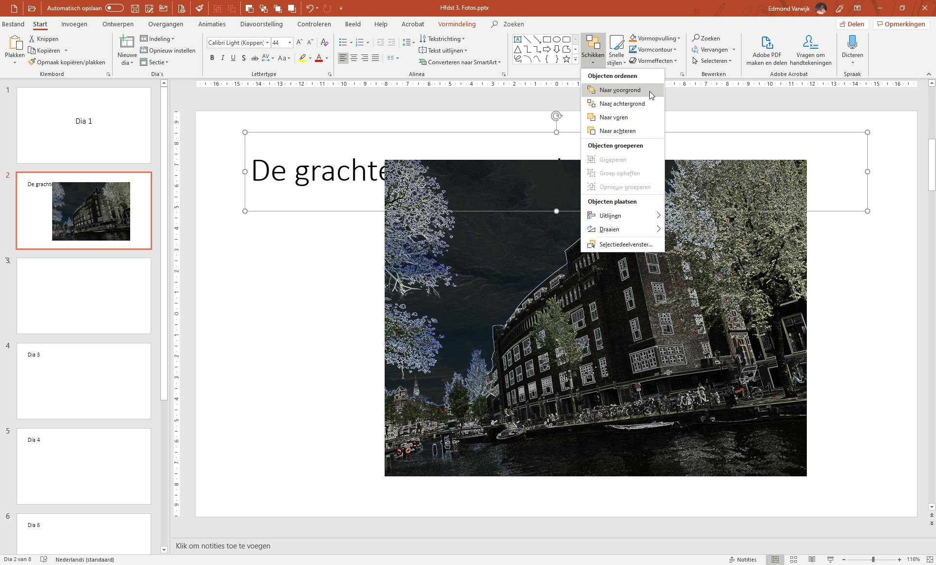 Gebruik je een standaard dia-indeling, dan zijn tekst en afbeeldingen altijd van elkaar gescheiden. Zodra je de indeling aanpast en de tekst of foto vergroot of verplaatst, dan is die zekerheid er niet. Dat hoeft ook niet, want het kan heel mooi zijn om tekst en foto’s te combineren. Een belangrijke regel in PowerPoint is dat wat als laatste wordt toegevoegd, altijd vooraan staat. Dat kan al snel betekenen dat een foto voor de tekst staat en deze dus onleesbaar wordt. Er zijn talloze manieren om dit aan te passen, maar de basis is het wijzigen van de volgorde van de items. De foto zal naar achteren moeten, de tekst naar voren of beide. Selecteer het tekstvak (!) dat deels achter de foto verdwijnt. Kies dan achtereenvolgend voor Vormindeling / Schikken / Naar voorgrond.