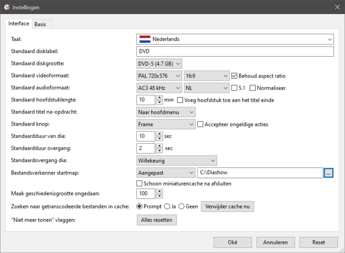 Ga nu binnen DVDStyler naar Configuratie en Instellingen. Dit om de standaardinstellingen zo aan te passen dat we zo dadelijk vliegend van start kunnen gaan. Daarbij je speciale aandacht voor deze onderdelen:
