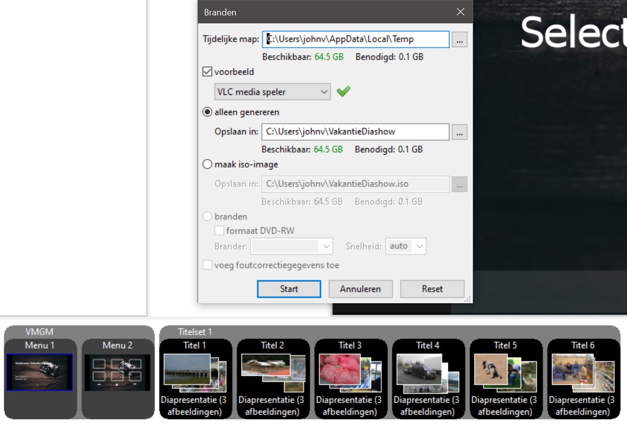 Op dit moment hebben we het skelet van het project overeind gezet: “Alle dia’s staan op hun plek.” Om te zien of dat skelet ook overeind blijft staan, kies je voor Bestand en Brand DVD. In het dialoogvenster plaats je een vinkje voor het veld Voorbeeld en je geeft aan dat er gebruik moet worden gemaakt van de mediaspeler VLC Media Player. Een druk op Start is voldoende om DVDStyler aan het ‘renderen’ te zetten en niet veel later (dat is afhankelijk van de hoeveelheid bestanden waaruit het project bestaat) kun je de dvd-video testen in de VLC Media Player.