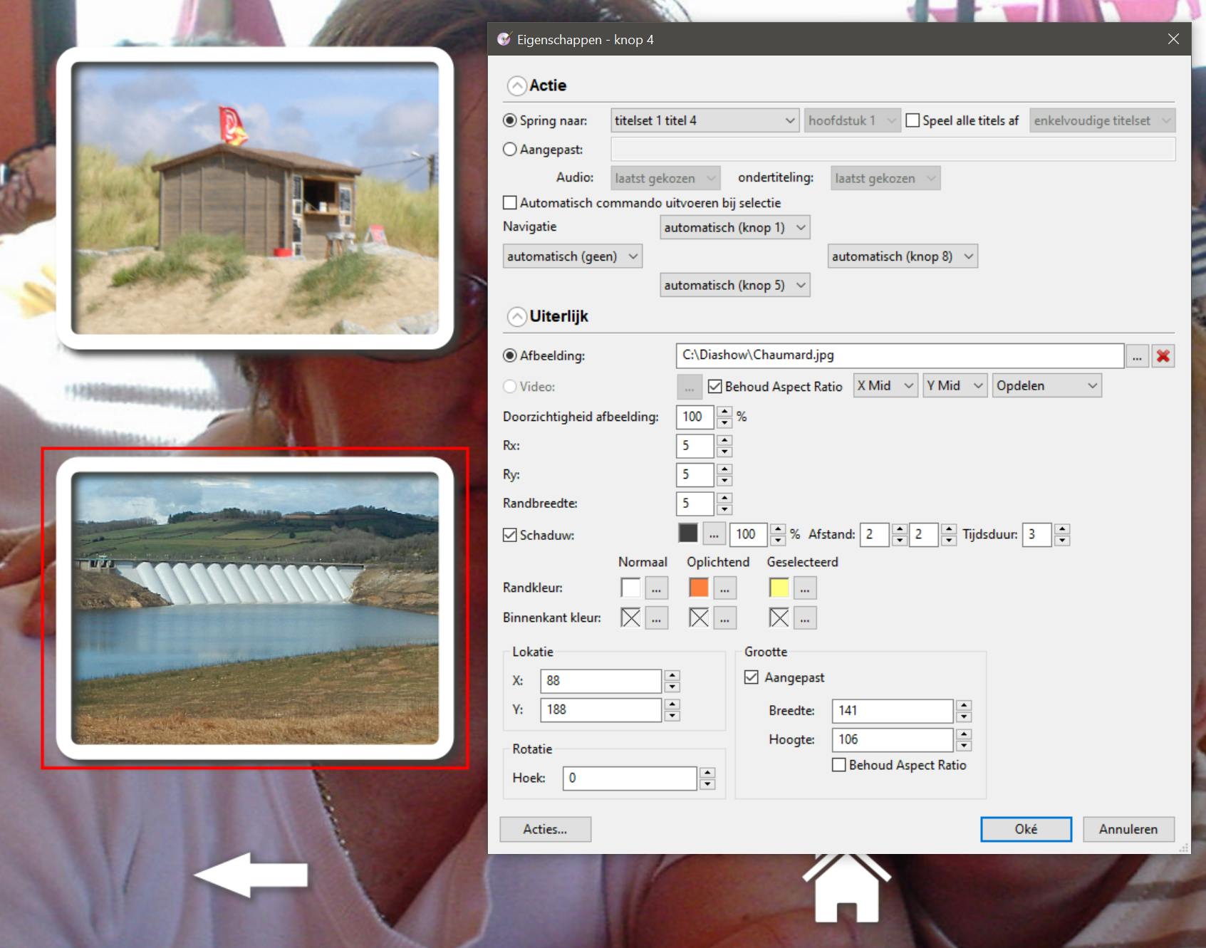 Vervolgens zijn stuk voor stuk de hoofdstukknoppen aan de beurt. Ook die klik je aan met de rechtermuisknop en ook nu kies je voor Eigenschappen. Bij het veld Afbeelding klik je op de 3 puntjes om daarna de juiste afbeelding te selecteren. De al genoemde sectie Grootte weet je intussen precies te vertellen wat de juiste hoogte-/breedte-verhoudingen zijn voor de plaatjes die ‘in’ de hoofdstukknoppen komen te staan; doe daar je voordeel mee.