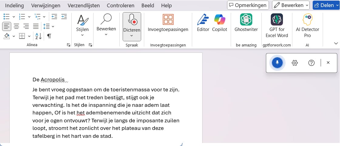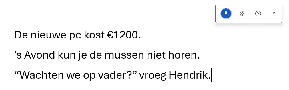 Belangrijk: spreek ook alle leestekens uit die je wilt toevoegen. Klik opnieuw op het pictogram van de microfoon als je klaar bent met dicteren. Het is tijdens het inspreken mogelijk om via het toetsenbord tekst te corrigeren of gewoon iets extra bij te typen. Dan moet je natuurlijk even zwijgen en als je klaar bent, plaats je de cursor op de plek waar je verder wilt gaan met dicteren.