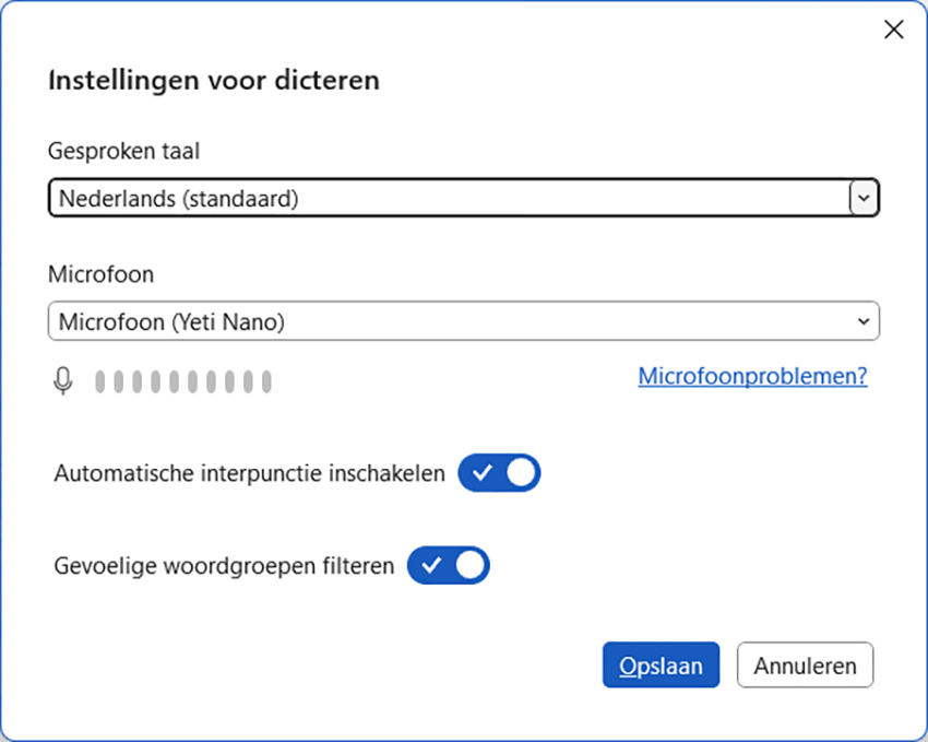 In het werkbalkje staat een tandwieltje waarmee je de instellingen van de dicteerfunctie regelt. Bovenaan selecteer je de Gesproken taal. De functie is standaard ingesteld in het Nederlands. Daaronder kies je de microfoon die je aanspreekt. In dit voorbeeld werken we bijvoorbeeld met een laptop, waarop we een externe microfoon hebben aangesloten. Wij hebben er in de instellingen voor gezorgd dat Word onze woorden via een goede externe microfoon opvangt en niet via de interne microfoon van de laptop.
