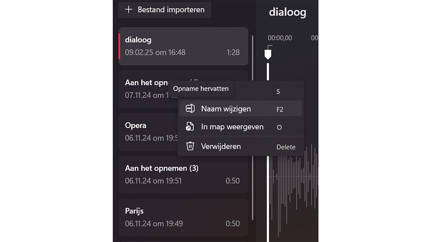 In de linkerkolom van de app lees je de namen van de opname. Iedere opname krijgt standaard de naam Aan het opnemen gevolgd door de datum en tijd. Ook zie je hoelang de opname duurt. Geef het bestand dat je dadelijk wilt transcriberen een eigen naam door met de rechtermuisknop in de linkerkolom op het bestand te klikken. Selecteer vervolgens de opdracht Naam wijzigen. Typ een nieuwe naam en bevestig.