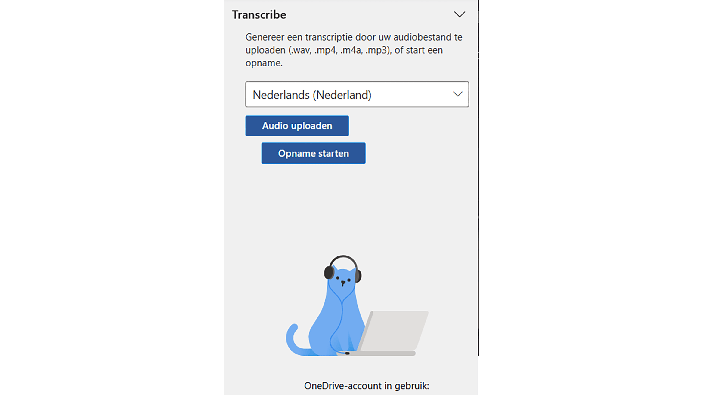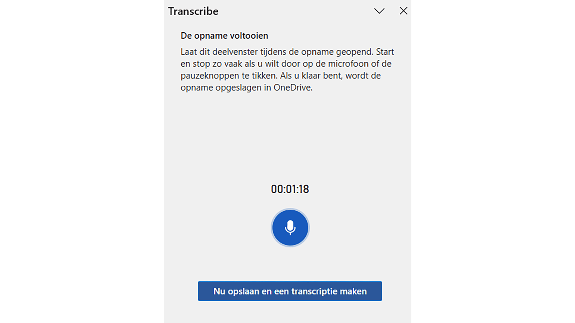 Wil je rechtstreeks gesproken tekst transcriberen? Klik dan op de blauwe knop Opname starten. Hiermee opent rechts het deelvenster Transcribe. Laat het deelvenster open tijdens de opname. Je ziet in het midden een blauwe microfoonknop. Als je daarop klikt, kun je de opname pauzeren. Klik er opnieuw op om door te gaan. Je kunt zo vaak starten en stoppen als je zelf wilt. Ondertussen loopt een teller die aangeeft hoelang de opname bezig is.