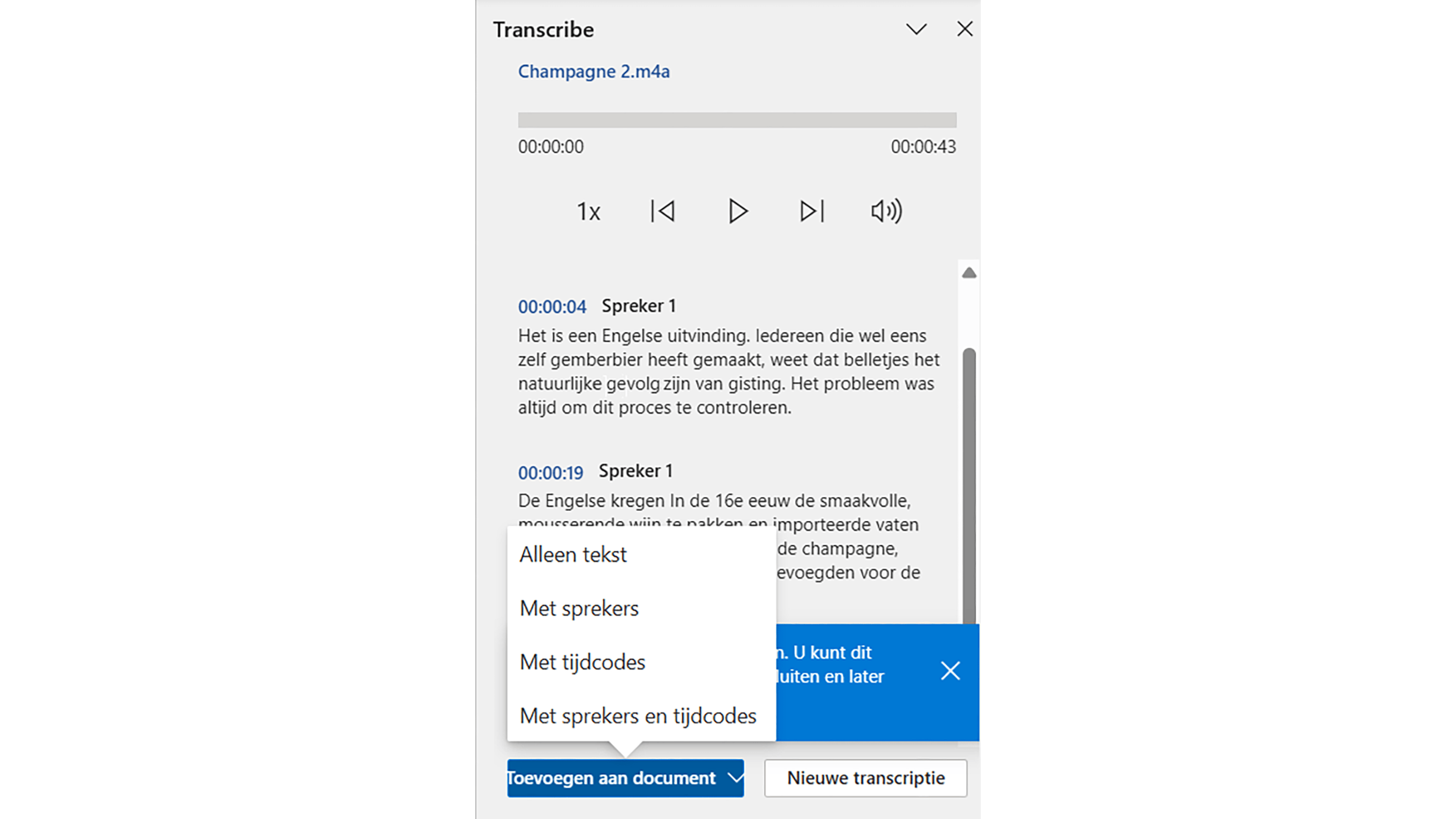 Het transcript wordt opgeslagen en je kunt dit deelvenster sluiten en later teruggaan. Om de transcriptie in het Word-document in te sluiten klik je op de knop Toevoegen aan het document. Daarmee verschijnt er een keuzemenu met vier opties: Alleen tekst, Met sprekers, Met tijdcodes en Met tijdscodes en sprekers. Geef aan wat je nodig hebt. In het Word-bestand staat bovenaan een link naar het wav-bestand met de opname en daaronder komt de uitgeschreven versie. Helemaal rechts onderaan in de zijbalk staat de knop om een Nieuwe transcriptie te starten.