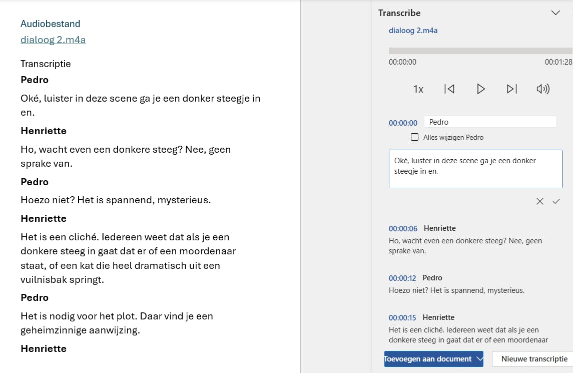 Voor de gelegenheid hebben we een dialoog opgenomen tussen twee personen. Opnieuw verschijnt het geluidsbestand bovenaan en de transcriptie in de zijbalk. Deze keer zie je duidelijk wat Spreker 1 heeft gezegd en hoe Spreker 2 heeft gereageerd. Om duidelijker te maken wie wat gezegd heeft, ga je met de muisaanwijzer over Spreker 1 en gebruik je het potloodje dat verschijnt. Op die manier wijzig je ‘Spreker 1’ bijvoorbeeld in de naam van deze persoon. Vink daarbij de optie Alles wijzigen Spreker 1 aan, zodat de aanpassing in de volledige transcriptie wordt uitgevoerd. Wanneer je met de muisaanwijzer over zo’n stukje tekst gaat, zie je niet alleen het potloodje, maar ook een plusteken. Door daarop te klikken voeg je dit stukje tekst toe aan het document zonder de link naar het audiofragment. Doorloop de tekst in de rechterbalk. Zitten er nog fouten in de tekst, dan kun je die daar corrigeren voordat je de inhoud toevoegt aan het openstaande Word-document.