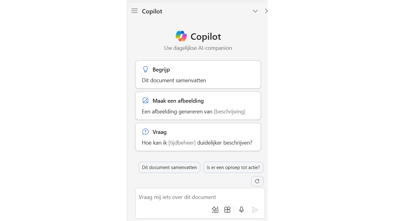 Heb je op deze manier een transcriptie gemaakt van een vergadering, dan kan dit behoorlijk uit de klauwen lopen. Om de tekst samen te vatten, zodat de lezer van dit verslag niet alles woordelijk moet verwerken, kun je een beroep doen op de AI van Copilot. Klik in het tabblad Start op de knop Copilot en voer een prompt in. Een prompt is een geschreven opdracht. Geef bijvoorbeeld als prompt: Dit document samenvatten. Klik op Enter en laat AI het werk doen.
