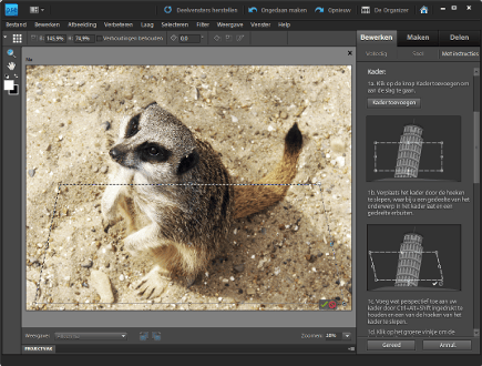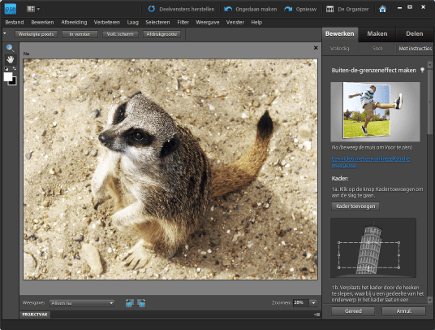 Photoshop Elements zit vol geavanceerde gereedschappen. Sommige effecten zijn best ingewikkeld om zelf te maken, omdat ze uit veel stappen bestaan en een redelijk diepgaande kennis van het programma vereisen. Vandaar dat Adobe enkele effecten van stap-voor-stap-instructies heeft voorzien. Zodoende zijn ze voor iedereen uit te voeren. Ga rechtsboven in de interface naar het tabblad Bewerken en klik op de knop Met instructies. Daar vindt u onder het kopje Grappige bewerkingen de optie Buiten-de-grenzeneffect. Zodra u die aanklikt, verschijnt een lange kolom met instructies. We willen niet al te streng overkomen, maar het is erg belangrijk dat u deze kolom exact stap voor stap doorloopt en goed leest wat er van u verwacht wordt. Alleen dan zult u het gewenste resultaat krijgen. We vertellen er alvast bij dat de stappen soms wat onduidelijk lijken en een vergissing is dan ook snel gemaakt. Raakt u de draad kwijt, klik dan op annuleren (de knop Annul.) en begin opnieuw.