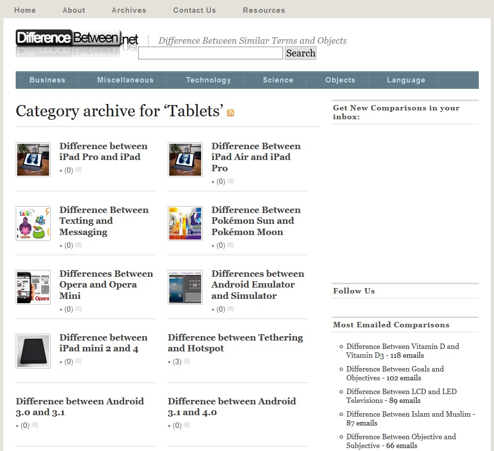 Wie kennis wil opdoen vindt op internet het ultieme pretpark. Alleen al op Wikipedia kan een mens moeiteloos de rest van zijn dagen slijten. Toch sta je ook bij die schitterende informatiebron met de handen in het haar wanneer je wilt weten wat het verschil is tussen twee zaken die nauw aan elkaar verwant zijn zoals een oerwoud en een bos. Hier biedt het onderhoudende www.differencebetween.net uitkomst. Deze Engelstalige site biedt elke maand vele interessante en diepgravende vergelijkingen op gebieden als economie, wetenschap, technologie, cultuur, voeding en taal. Voer voor nieuwsgierigen.