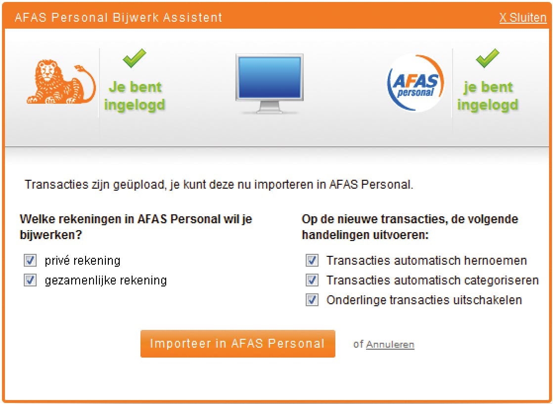 Om dit online huishoudboekje toegang te geven tot uw bankgegevens, moet u eerst bij uw online bank een rekening selecteren en deze gegevens exporteren. Vervolgens kunt u dit bestand importeren in Afas Personal. De gemakkelijkste manier om dat te doen is met de Bijwerk Assistent. Dit is een browserplugin die de transacties van uw internetbankieren tot een jaar terug automatisch in uw huishoudboekje zet. Deze Bijwerk Assistent werkt uitsluitend met ING Bank, Rabobank, ABN Amro, SNS Bank en ASN Bank. Zit u bij een andere bank, dan moet u de transacties volgens de richtlijnen handmatig exporteren en daarna importeren. Om even te proberen, staat er een testbestand online. De online banken laten maar een export toe over een beperkte periode.