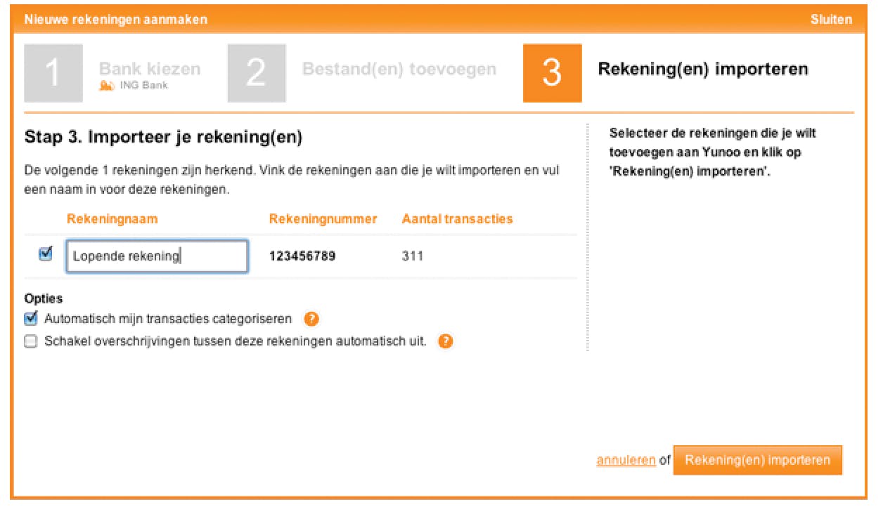 Nadat u de gegevens van een rekening hebt geïmporteerd, kunt u later met de knop Bijwerken opnieuw transacties importeren en de vorige import hiermee aanvullen. Na het uploaden van het bestand kunt u de rekening een naam geven. Vink de optie Automatisch Mijn Transacties Categoriseren aan. Afas Personal herkent meer dan de helft van de transacties en kan dus zelf aangeven tot welke categorie ze behoren. Een aankoop bij een supermarkt zal het automatisch in de categorie Boodschappen onderbrengen. Wanneer u regelmatig overschrijvingen tussen uw betaalrekening en uw spaarrekening uitvoert, zou dit een vertekend beeld kunnen geven. Een overschrijving naar een spaarrekening is immers geen uitgave. Daarom activeert u de optie ‘Schakel overschrijving tussen deze rekeningen automatisch uit’.