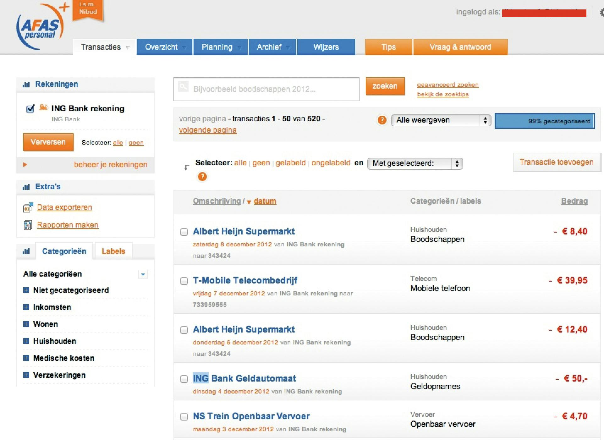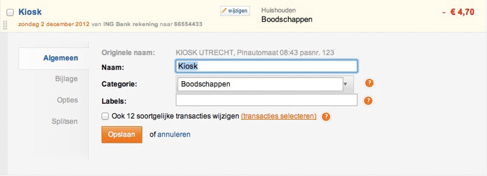 Wanneer de automatische categorieherkenning zich vergist, of wanneer het programma simpelweg geen enkele categorie herkent, kunt u op de transactie klikken, zodat de knop Wijzigen verschijnt. Via die knop kunt u de naam van de transactie wijzigen en de categorie invullen. Bovendien is het mogelijk om iedere transactie te labelen. U kunt zoveel labels aan een transactie toevoegen als u zelf wilt. Labels maken transacties herkenbaar en makkelijker vindbaar.