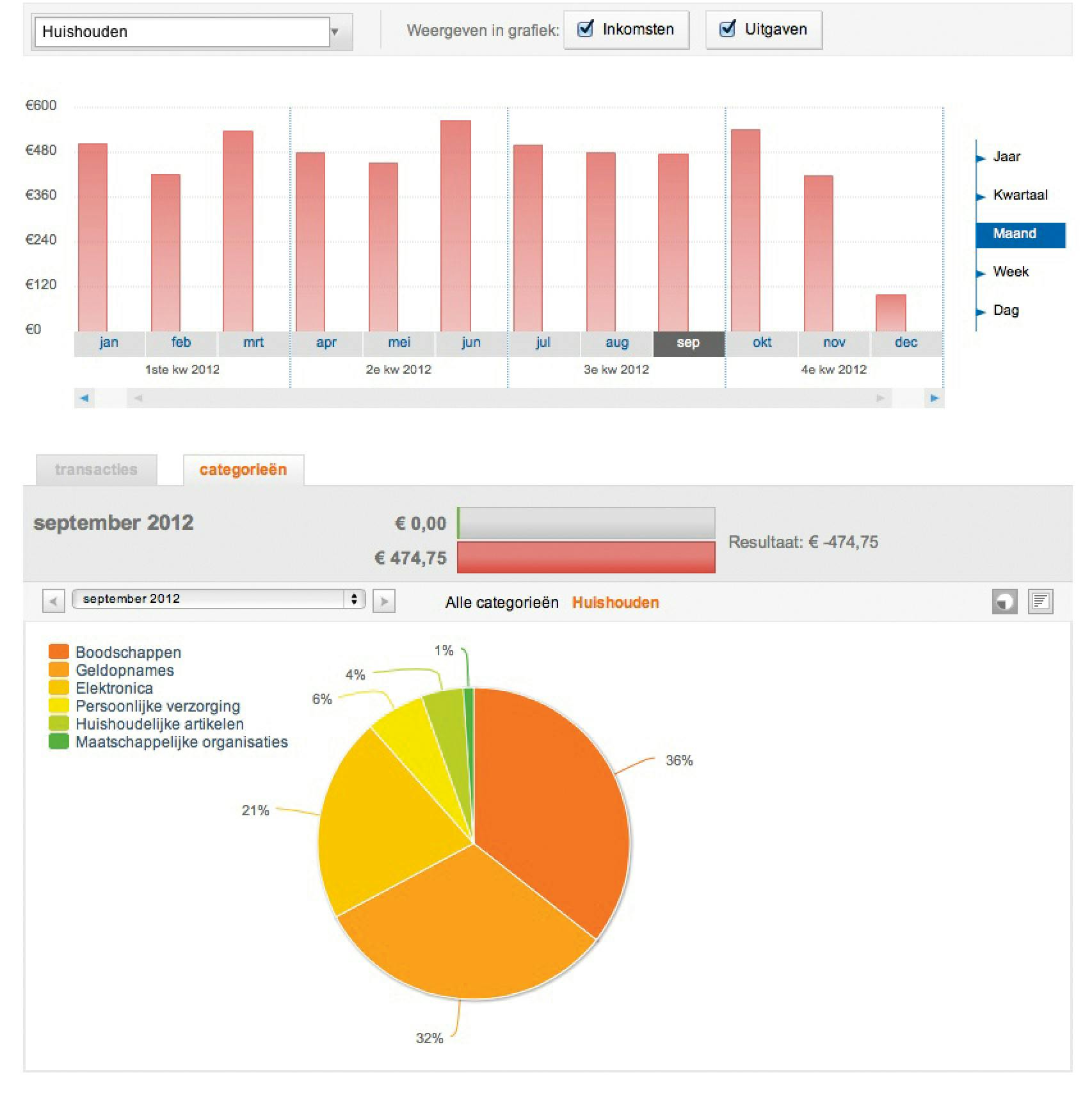 Via Overzicht, Inkomsten/Uitgaven opent zich eerst een staafdiagram waar de inkomsten en uitgaven in rode en groene balken worden weergegeven. U kunt de totalen per dag, week, maand, kwartaal of jaar opvragen. Standaard worden alle categorieën bij elkaar gevoegd zodat u de totale inkomsten en uitgaven ziet. U kunt ook van elke categorie afzonderlijk de totalen opvragen. Op die manier vergelijkt u bijvoorbeeld de vervoersonkosten voor de maand augustus met die van september. Daaronder vraagt u in een taartgrafiek per categorie de uitgaven en inkomsten.