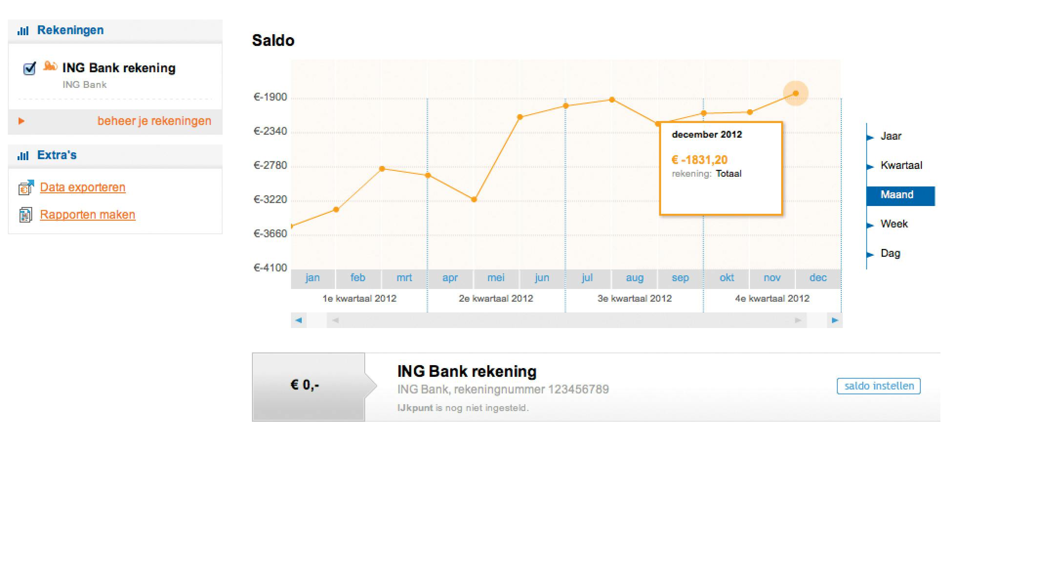 In het menu Overzicht vindt u de functie om het saldo op te vragen. Ook hier krijgt u in een overzichtelijke grafiek de evolutie van uw saldo. Wanneer u met de muisaanwijzer over de punten van de grafiek gaat, verschijnt er een kadertje met daarin het saldo aan het begin van de betreffende periode. Aan de onderkant van de grafiek staan de rekeningen per regel die aan de linkerkant zijn geselecteerd. Als u de eerste keer op de saldopagina komt, moet u het saldo instellen. Dat betekent dat u het saldo moet invullen op de dag van de laatste transactie.
