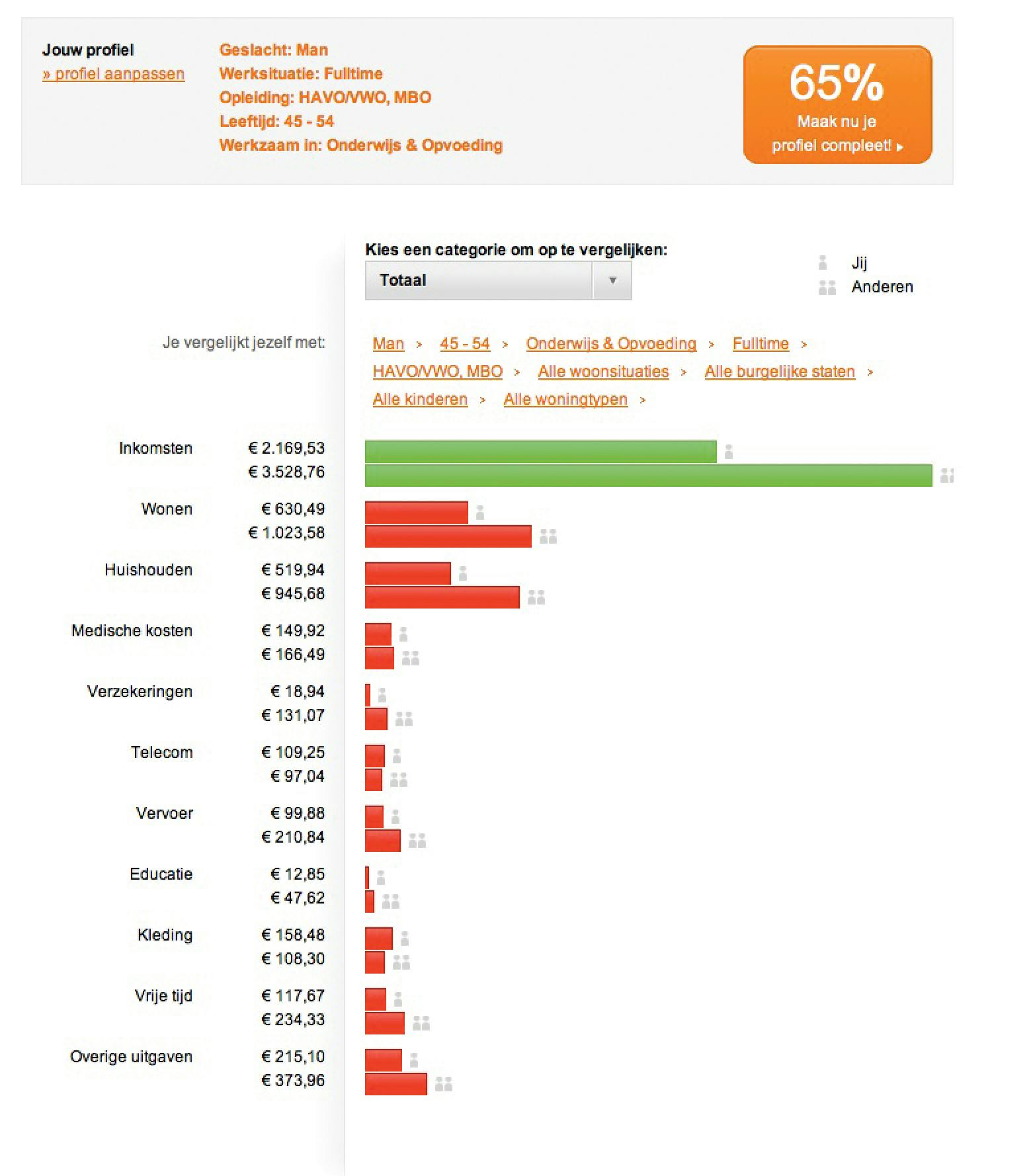 Het is mogelijk om uw inkomsten en uitgaven discreet te vergelijken met de community die Afas Personal gebruikt. Daarvoor moet u wel eerst uw profiel opgeven zodat de tool rekening kan houden met uw regio, opleiding, woonsituatie, burgerlijke staat enzovoort. Rechts bovenaan in een oranje vakje leest u in een percentage hoe volledig uw profiel is. Eerst leest u een totaalvergelijking. Het bovenste balkje is uw situatie en daaronder staat de situatie van vergelijkbare personen in de community. Daarnaast kunt u met een uitklapmenuutje ook categorie per categorie vergelijken.