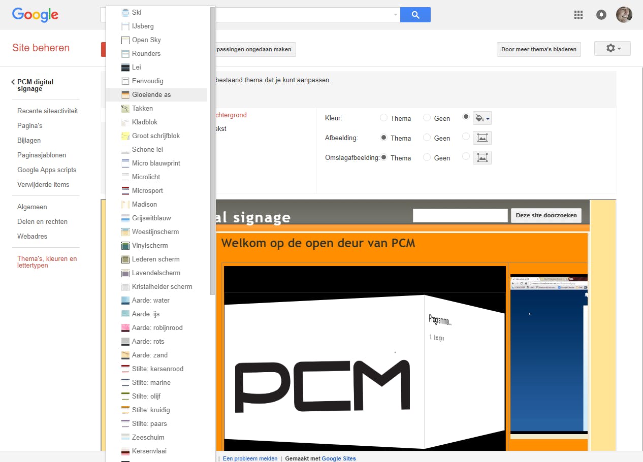 Wanneer je op Opslaan klikt wordt het tandwielpictogram zichtbaar: klik hierop en kies Site beheren / Thema’s, kleuren en lettertypen. Je kunt nu een ander basisthema instellen of zelf de diverse componenten een ander uiterlijk geven.