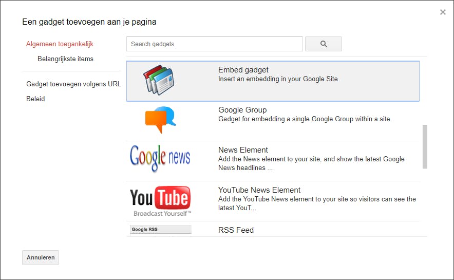 We willen nu een paar mediabestanden toevoegen: schakel over naar de paginabewerkingsmodus. Klik in de eerste tabel, kies Invoegen en selecteer Meer gadgets… / Algemeen toegankelijk, waarna je Embed gadget aanklikt (hier staan trouwens allerlei handige gadgets zoals Datum en tijd en RSS Feed).