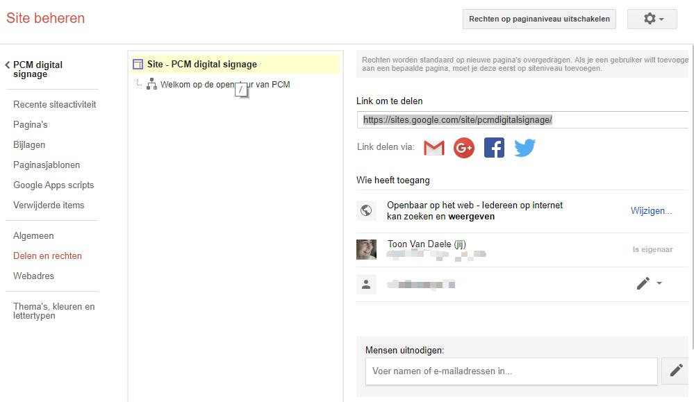 Je kunt nu per pagina andere personen toegang verlenen. Daartoe moet je die personen wel eerst op siteniveau toevoegen. Zodra dat is gebeurd kun je de standaardtoegang tot je pagina wijzigen in Iedereen met de link mag weergeven en kun je voor de toegevoegde personen de machtiging mag bewerken instellen.