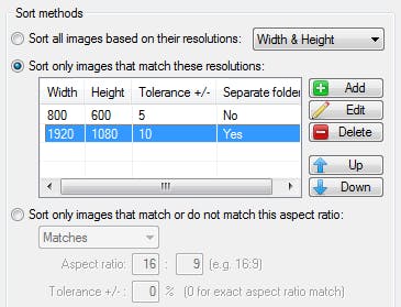Tot slot kun je ook alleen foto’s laten sorteren die wel of net niet overeenkomen met een door jou ingestelde beeldverhouding, zoals 16:9 of 4:3. Als je dat verkiest koppel je hier nog een pixelbereik aan vast, zodat bijvoorbeeld alleen foto’s tussen 400.000 en 900.000 pixels in aanmerking komen.