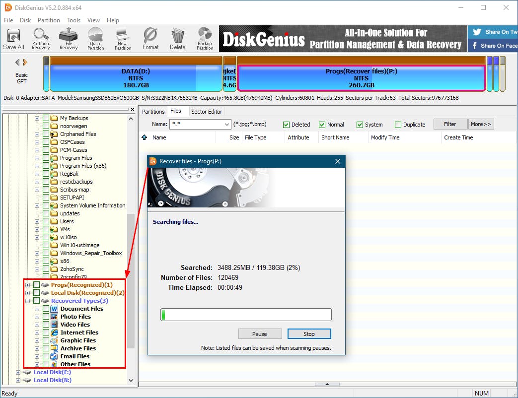 Selecteer je een partitie, dan kun je de inhoud ook op bestandsniveau bekijken, wat perspectieven voor dataherstel biedt. Met een druk op de knop instrueer je DiskGenius om naar verloren (gewaande) data te zoeken, waarbij je zelf aangeeft in welke bestandstypes je geïnteresseerd bent. Zo’n scan laat zich op elk moment onderbreken, waarna je de gevonden data al meteen kunt herstellen.