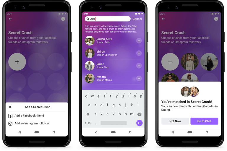 Je kunt ervoor kiezen om gekoppeld te worden aan directe Facebook-vrienden of aan vrienden van vrienden. Een match kan ook ontstaan met iemand die geheel buiten je contacten valt. Om ongemakkelijke situaties te voorkomen, kun je alleen gekoppeld worden aan directe vrienden als jij (maar ook de andere gebruiker) de Secret Crush-optie aan hebt staan. Hierna kun je tot negen Facebook-vrienden selecteren die jij wel ziet zitten.