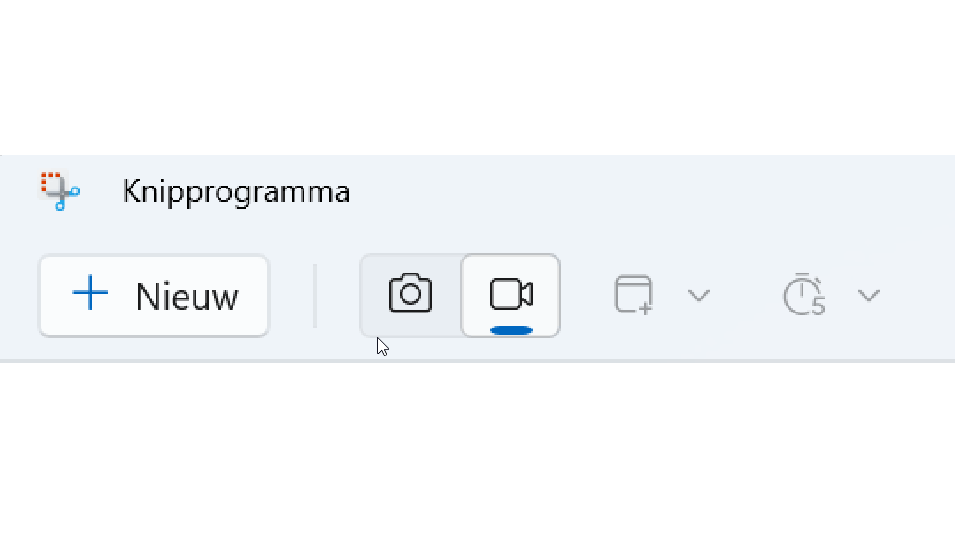 Open het Startmenu en typ knipprogramma. Of nog sneller: gebruik de toetscombinatie Windows-toets+Shift+S. Boven in het hoofdvenster vind je de knop met een camera. Klik hierop om de filmmodus te activeren. Klik hierna op Nieuw. Er verschijnt nu een venster, waarin je het opnamegebied kunt selecteren. Klik vervolgens op Start om de opname te beginnen. Boven in het scherm vind je de opnameknoppen, waarmee je onder meer de opname kunt pauzeren en beëindigen.