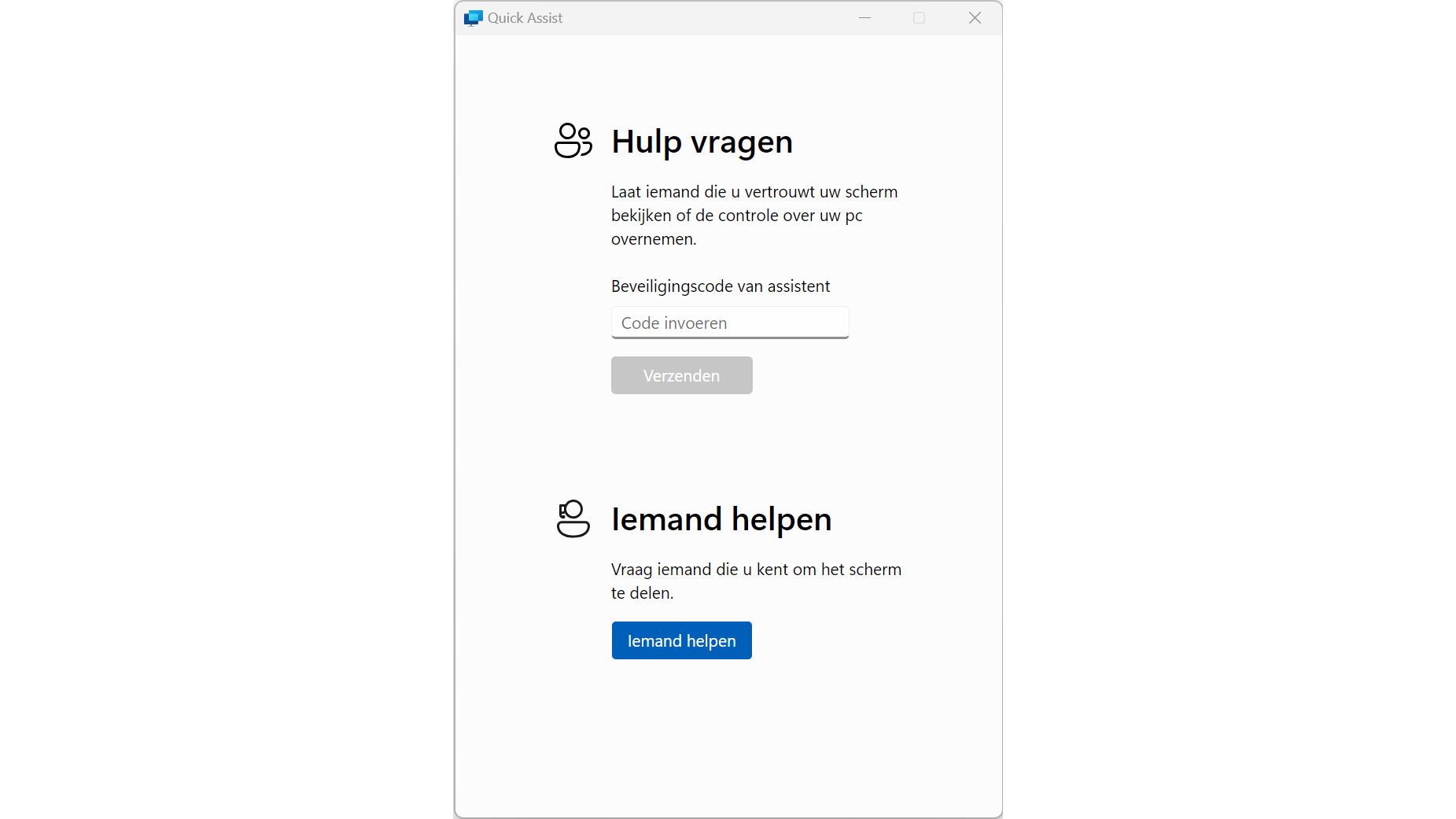Typ Quick Assist in het Startmenu. Om het scherm van iemand anders te delen, klik je op Iemand helpen. Via het vak Beveiligingscode van assistent kun je een code opgeven waarmee de ander de controle van de computer kan overnemen.