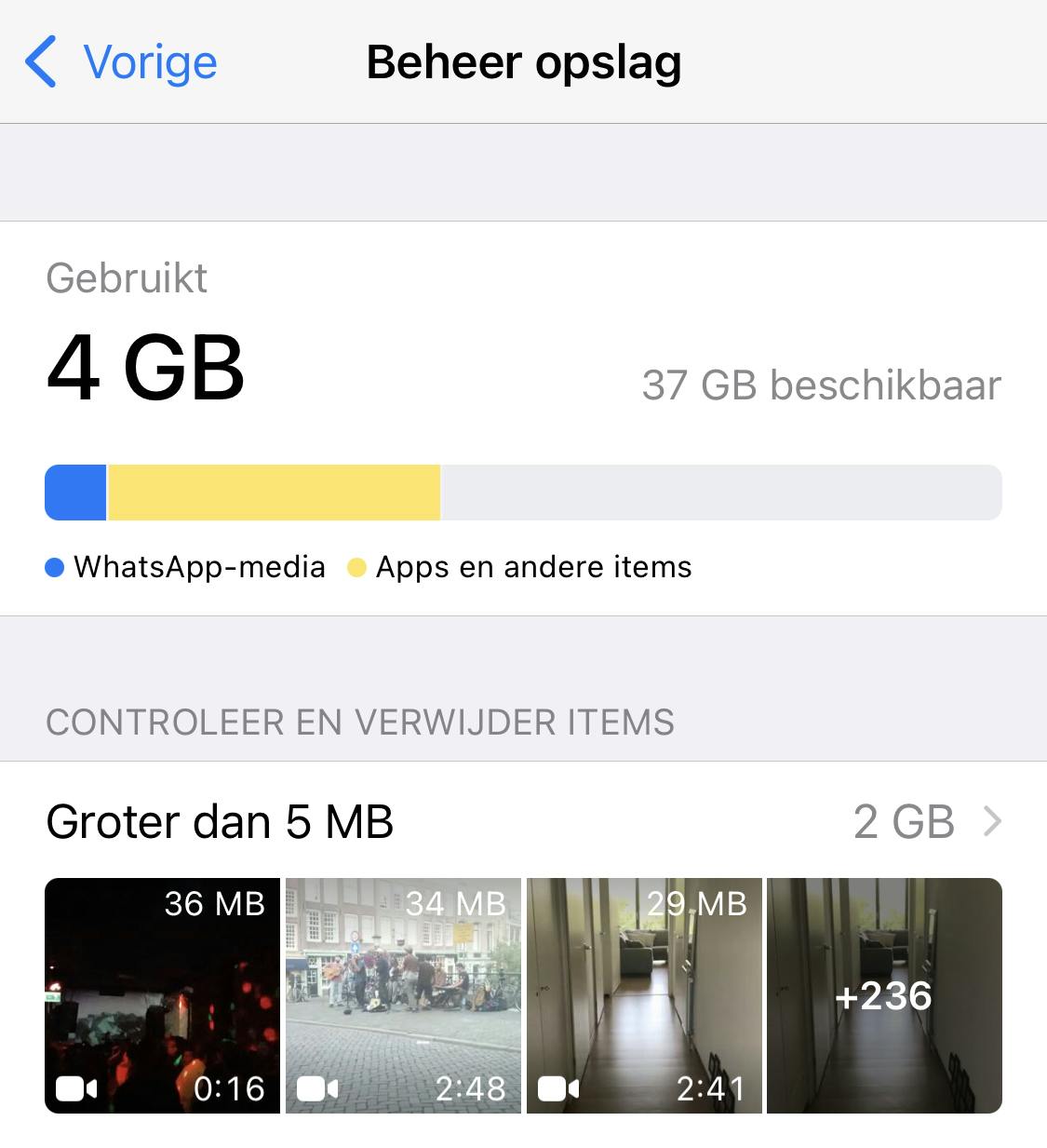 Door de update kun je niet alleen de grootste bestanden eruit pikken, maar ook bestanden die vaak zijn doorgestuurd. Dergelijke bestanden circuleren doorgaans al meerdere keren op je smartphone en WhatsApp kan die dubbele foto’s, gifjes of video’s er nu tussenuit pikken.