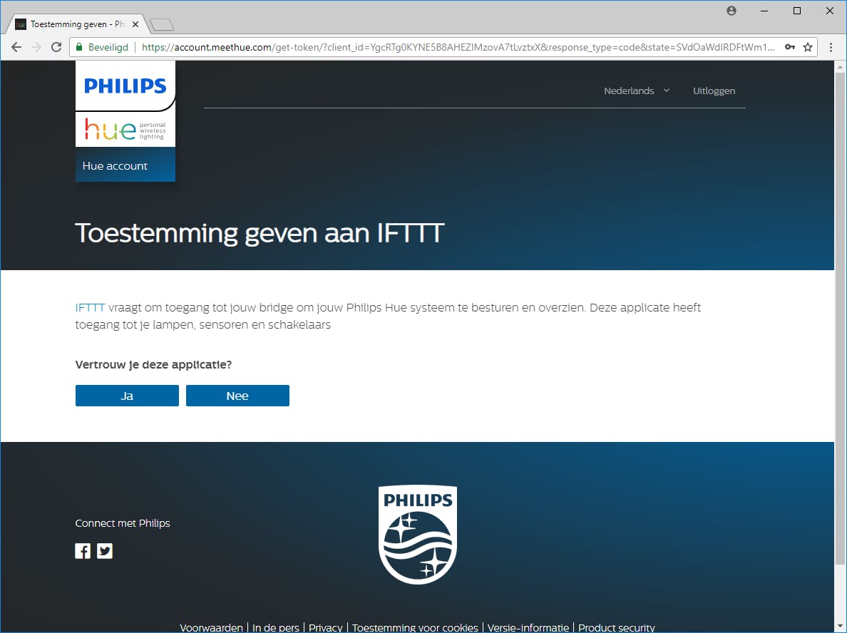 Via spraak je (Philips Hue-)lampen bedienen? De Nederlandse Google Assistent is daar nog niet aan toe, maar hopelijk niet lang meer. Een achterdeurtje is er wel, in de vorm van IFTTT (If This Than That), waarmee je veel zaken kunt automatiseren. Koppel eerst de twee accounts met elkaar: ga hiernaartoe en maak zo nodig een account aan bij IFTTT. Log in en kies Connect. Log daarna in met je Hue-account en geef toestemming voor toegang door IFTTT. Heb je nog geen Hue-account, dan maak die je die waarbij je ook meteen het account aan je bridge koppelt. Je kunt nu aan de slag met IFTTT-recepten (zie tip 16)!