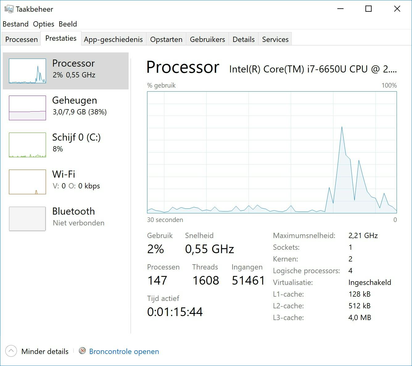 Het tabblad Prestaties geeft de prestaties van je computer dynamisch weer, onderverdeeld in processor, geheugen, schijven, ethernet, wifi, bluetooth et cetera. Deze lijst kan variëren op basis van wat er op je computer aangesloten of ingeschakeld is. Door op een item te klikken, kun je allerlei details over de hardware en de prestaties zien.