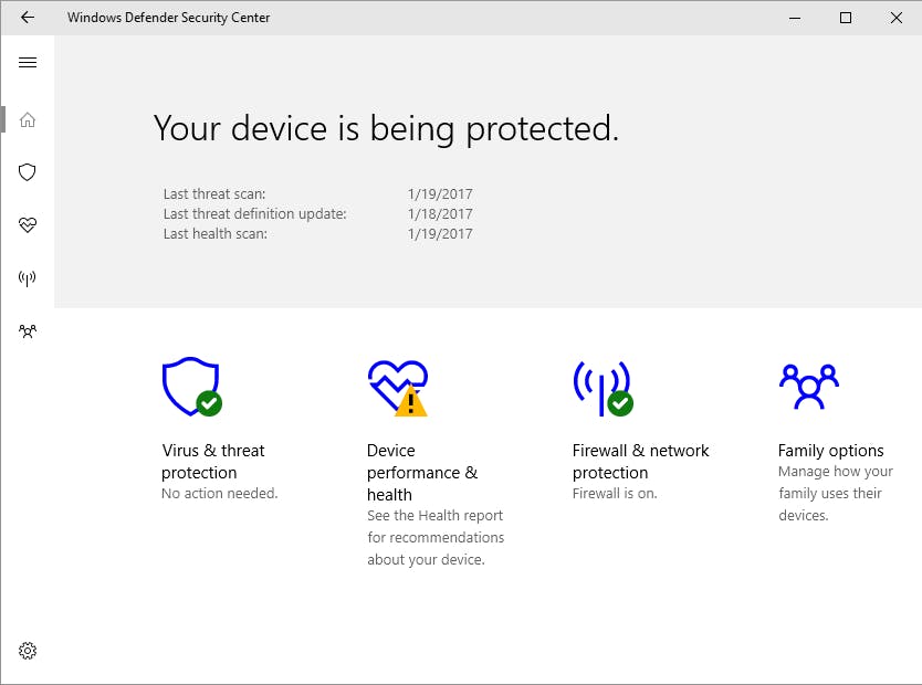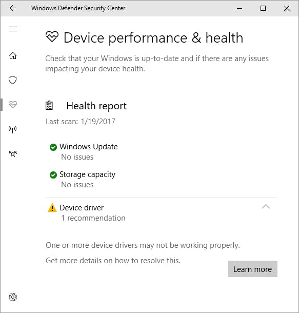In de nieuwe Build 15007 is een aantal van die onderdelen samengevoegd in het Windows Defender Security Center. Vanuit dit programma, dat bereikbaar is vanuit de instellingen en de taakbalk, wordt nu informatie getoond van de virusbeveiliging, maar ook of de firewall goed is ingesteld en of er geen stuurprogramma's ontbreken of onjuist zijn geïnstalleerd.