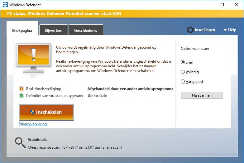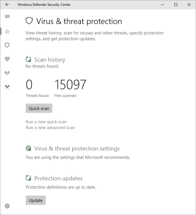 Op ieder onderdeel in het Security Center kun je klikken voor meer informatie. Klik je bijvoorbeeld op Virus & threat protection, dan wordt de nieuwe Defender-interface geopend. Ook deze software is nu geheel in de nieuwe Windows 10-stijl; in de huidige versies van Windows 10 is Windows Defender nog een 'gewoon' Windows-programma.