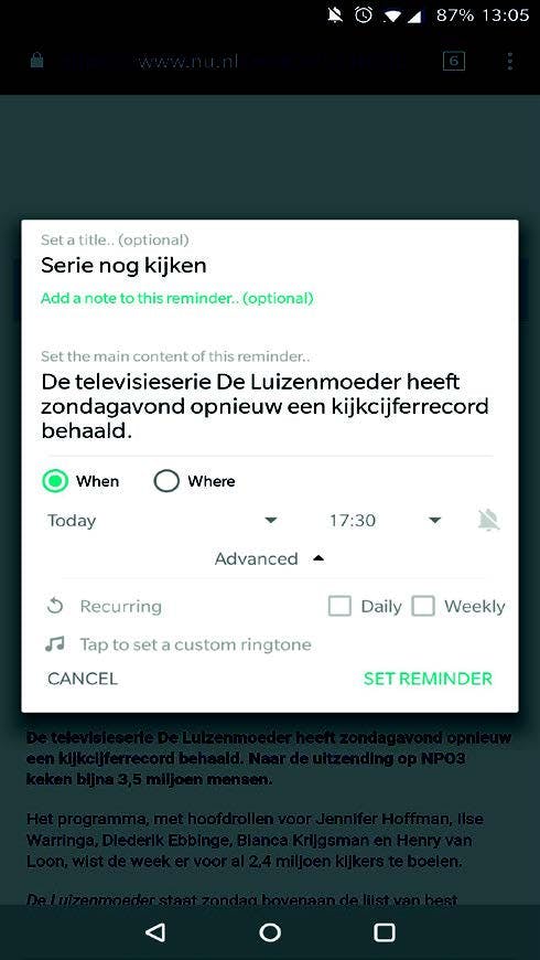 Remindee helpt je dingen herinneren. Veel apps hebben een deelicoontje waarmee je dingen naar vrienden kunt sturen of op sociale media kunt posten. Als je Remindee hebt geïnstalleerd, kun je ook dingen naar Remindee sturen. Je geeft een titel en een notitie op, en een datum en tijd waarop je aan de inhoud herinnerd wilt worden. De app is simpel en heeft verder vrij weinig functies, maar kan handig zijn als je vaak dingen vergeet.