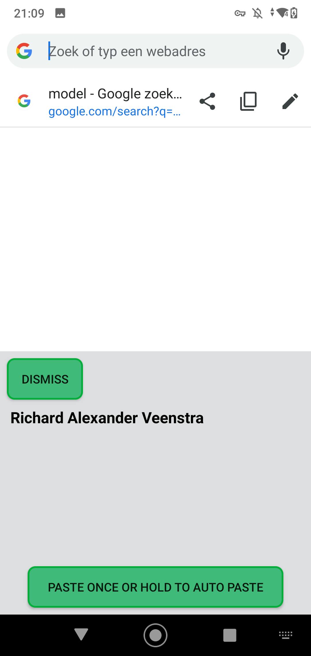 Niet alleen informatie voeg je toe aan de database, dat geldt ook voor korte zinnetjes die je vaak gebruikt, zoals ‘ik ben onderweg’ of ‘ik bel je zo terug’. Tik op het wereldbolletje in je toetsenbord om het Auto Paste Keyboard (ook voor iOS) te selecteren en kies een van je teksten.