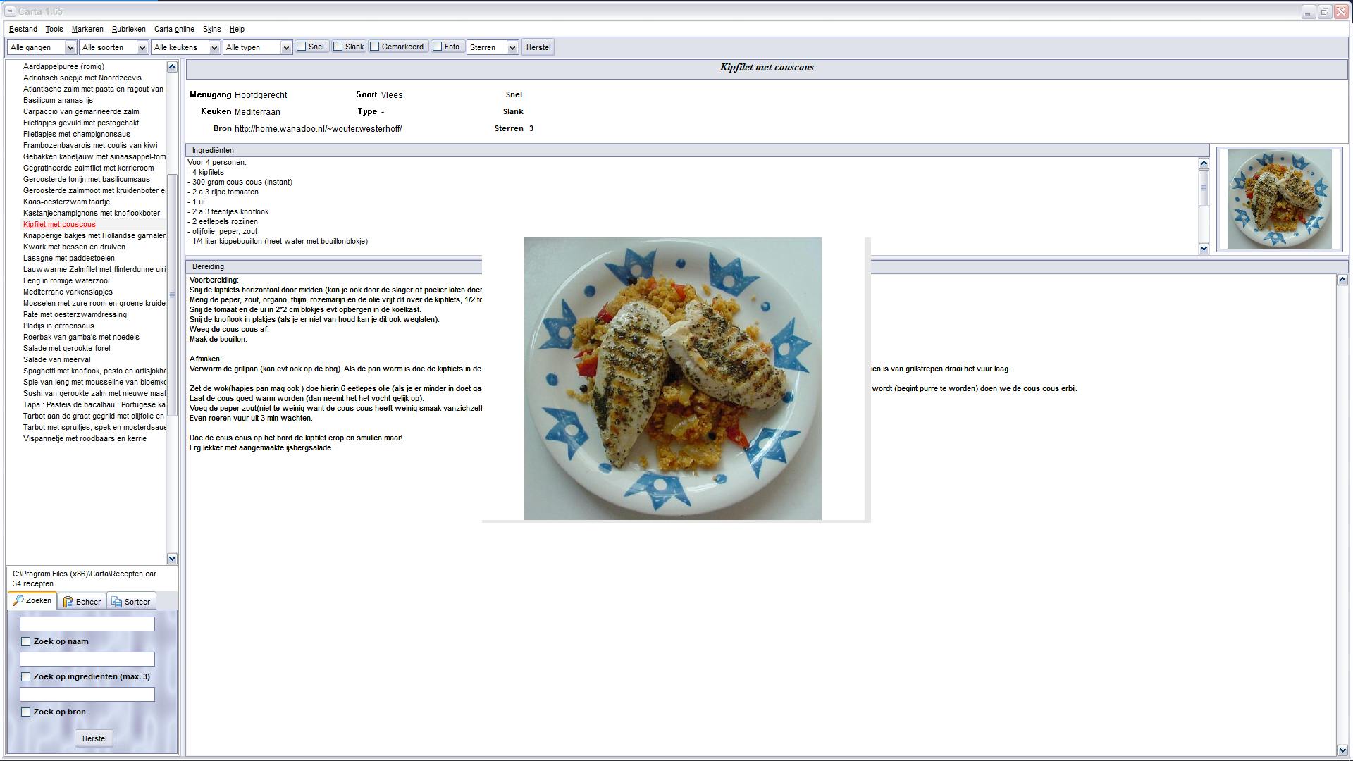 Het wemelt op tv van de kook- en bakprogramma’s en ook Michelin-sterren en andere culinaire hitlijsten kunnen zich verheugen in een ruime belangstelling. En dan zijn er natuurlijk nog al die websites met recepten en al die apps die je de kostelijkste gerechten voorschotelen. Kunnen kiezen uit miljoenen recepten is natuurlijk mooi maar je zult al snel merken dat je door de bonen de bos uien niet meer ziet. Een gemiddeld mens eet namelijk doorgaans een beperkt aantal vaste favorieten. Een ouderwetse receptendatabase die desnoods langzaam groeit en gewoon op de eigen pc bewaard wordt is dan ook wel zo handig. Carta is zo’n database. Het programma is al wat ouder en daardoor lekker compact. En … ondanks de leeftijd doet het alles wat we mogen verwachten. Zo kun je zoeken op basis van naam of ingrediënt en filteren op criteria zoals gang, soort gerecht of nationaliteit. Daarnaast kun je speciaal zoeken naar snelle of lichte gerechten. En natuurlijk kun je je eigen favorieten toevoegen. De beperkte meegeleverde recepten-database kan volop worden aangevuld met de kookboekjes op de website van het programma en van databases elders op internet.