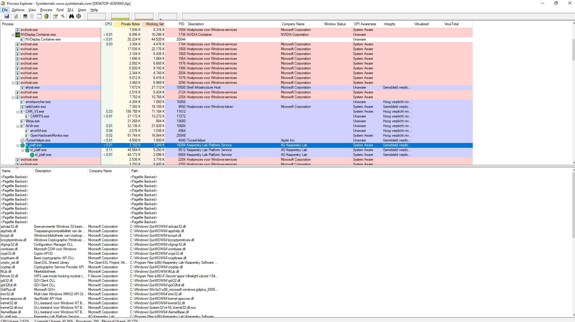 Process Explorer toont alle actieve processen waarbij via kleuren onderscheid wordt gemaakt tussen systeem- en gebruikersprocessen. Standaard toont het programma een handvol kolommen met informatie maar je kunt uit tientallen kiezen, al naar gelang het soort informatie dat je zoekt. Favoriete kolomconfiguraties kun je ook opslaan.