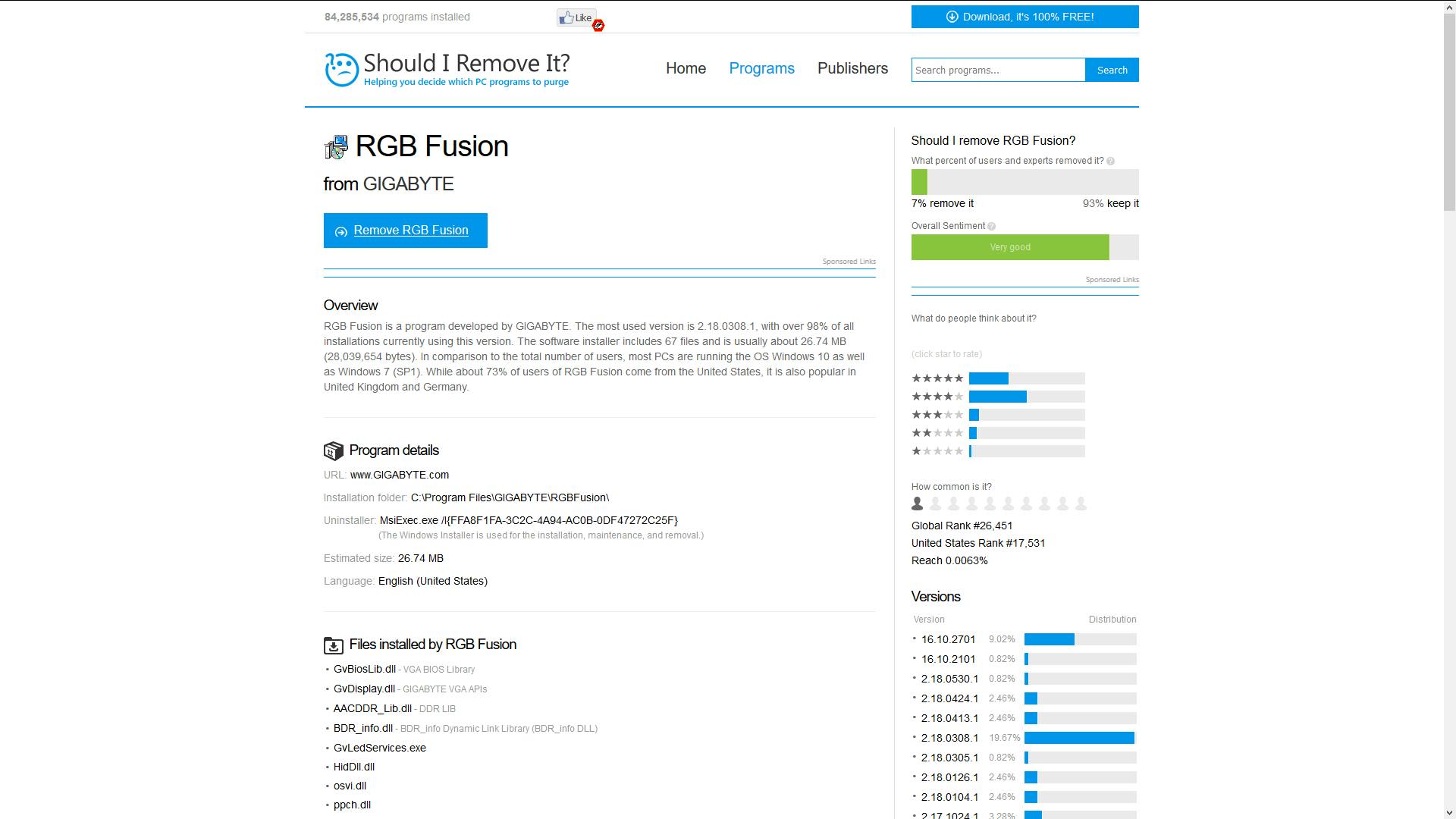 Een mooie functie van het elders op deze pagina’s besproken Process Explorer is de mogelijkheid om een proces naar de dienst Virustotal te sturen om het daar door tientallen virusscanners te laten besnuffelen. Als die het sein ‘veilig’ geven, wil dat echter nog niet zeggen dat je het bijbehorende programma ook op je pc wilt hebben. Regelmatig installeren bedrijven ongevraagd componenten die je niet per se nodig hebt en soms liften ze mee met programma’s die je zelf installeert. Om op een andere manier zicht te krijgen op wat er nu allemaal in je pc actief is, is er de handige dienst Should I Remove It. Van deze dienst bestaat ook een bijbehorend programma maar dat is wanneer we dit schrijven tijdelijk niet beschikbaar in de EU omdat men de software moet aanpassen aan nieuwe privacy-richtlijnen. De bijbehorende website is echter ook voor ons nog gewoon bruikbaar en daar kun je de naam van allerlei programma’s opgeven. Als de dienst het programma kent dan krijg je een groot aantal statistieken te zien (zoals een gebruikerswaardering en hoeveel mensen het programma hielden) en nuttige technische gegevens zoals versienummers en geïnstalleerde bestanden.