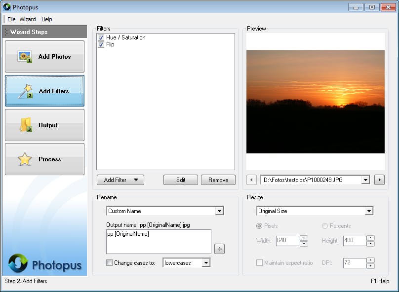 Veel fotobewerkers zijn bedoeld om één afbeelding tegelijk op te lappen. Als ze al mogelijkheden bieden om bijvoorbeeld alle plaatjes in een map te verwerken dan vergen die vaak de nodige studie. Zo niet bij het kinderlijk eenvoudige Photopus. Dit programma lust een groot aantal beeldformaten (met uitzondering van png, pdf en raw die alleen door de Pro-versie worden ondersteund) en daar kun je een breed scala aan bewerkingen op loslaten. De werkwijze in Photopus is zeer rechttoe-rechtaan. Je kiest een map met foto’s of een aantal losse afbeeldingen en voegt vervolgens bewerkingen toe. Dat kunnen technische bewerkingen zijn zoals het aanpassen van contrast en helderheid of het roteren, spiegelen of bijsnijden van een plaatje. Photopus heeft echter ook een heleboel filters aan boord, bijvoorbeeld om foto’s om te zetten naar zwartwit of sepia, om maar enkele van de meer nuttige te noemen. Je kunt zo veel bewerkingen toevoegen als je maar wilt. Vervolgens geef je op of foto’s eventueel verkleind moeten worden en waar ze moeten worden opgeslagen en kan Photopus de klus starten. Helaas zit het toevoegen van een watermerk niet in de gratis versie.