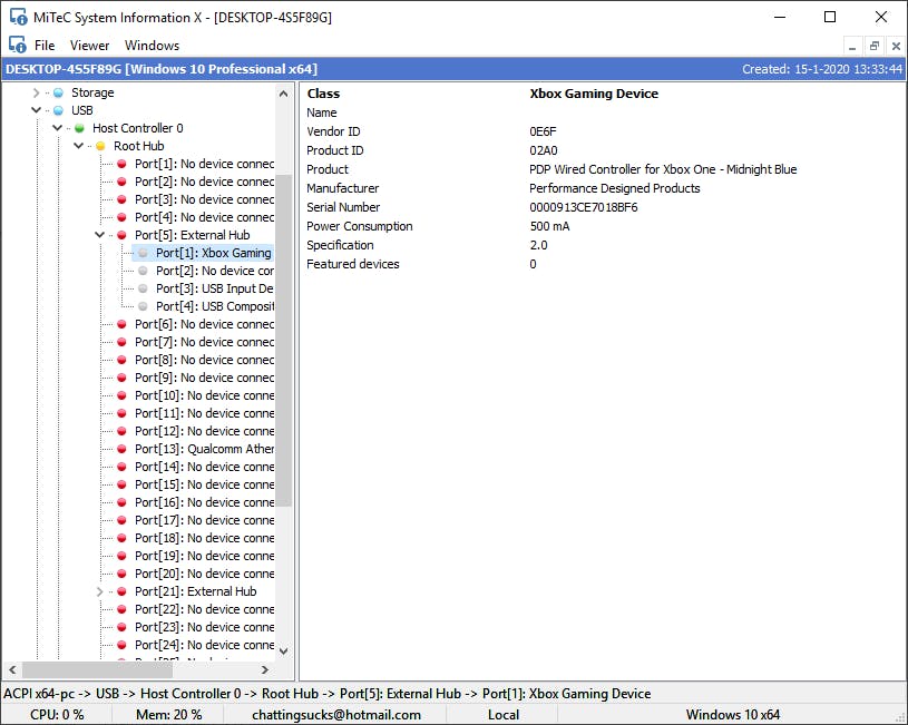 Wil je echt het naadje van de kous weten wat betreft informatie over je pc en toebehoren, dan heb je waarschijnlijk niet genoeg aan de gegevens die Windows zelf verstrekt. System Information X is in dat geval een zeer interessant programma. Het geeft je namelijk een uitgebreid overzicht van alle aanwezige hardware, verzamelt informatie over de geïnstalleerde Windows-versie en over de programma’s op je systeem. De hardware-afdeling geeft de gebruikelijke informatie over de processor, het geheugen, de harde schijven, enzovoort. Maar één onderdeel springt hier eruit: de gedetailleerde informatie over usb-poorten en de daarop aangesloten apparaten. Het geeft namelijk ook weer hoeveel stroom die apparaten gebruiken. En die informatie kan weer cruciaal zijn wanneer de poort regelmatig niet goed werkt, bijvoorbeeld dus door een te zwakke voeding.